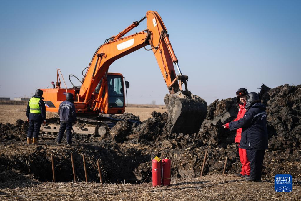 2月6日,中國石油遼河油田興隆臺輸氣分公司巡線工人(右二)在施工現場與施工人員交流維修情況。