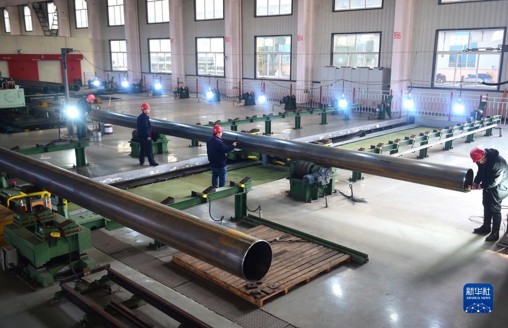 2月7日,河北鹽山縣一家管道企業(yè)的工人在生產(chǎn)輸氣鋼管。