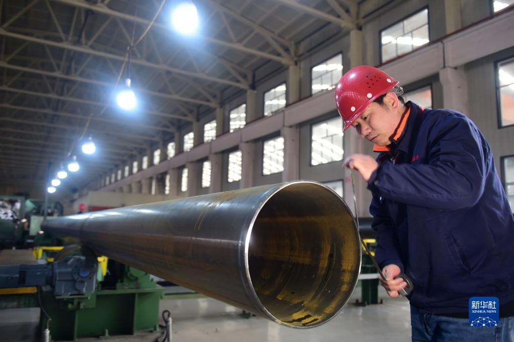 2月7日,河北鹽山縣一家管道企業(yè)的工人在檢測(cè)鋼管質(zhì)量。