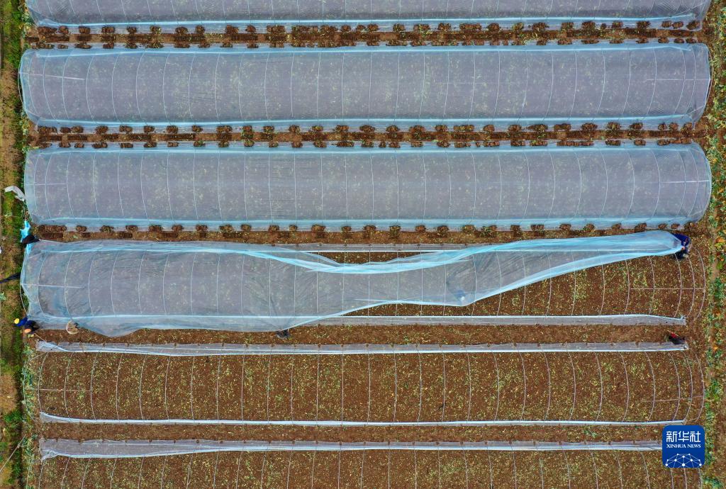 2月7日,在浙江省溫嶺市東浦新塘,西瓜種植戶在覆蓋西瓜大棚塑料薄膜,準(zhǔn)備種植新一季西瓜(無人機(jī)照片)。