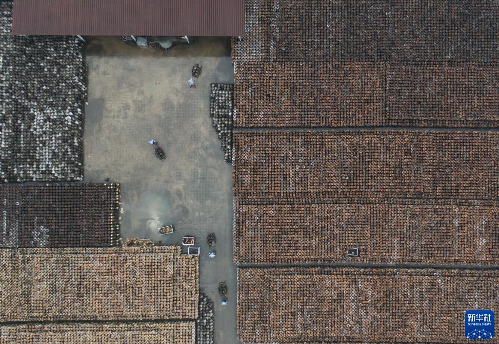 2月7日,工作人員在位于紹興市上虞區的女兒紅酒廠運送酒壇(無人機照片)。新華社記者 翁忻旸 攝