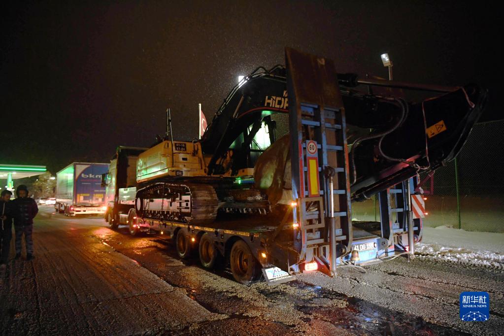這是2月6日晚在土耳其伊斯坦布爾至安卡拉公路上拍攝的運往災區的大型機械。