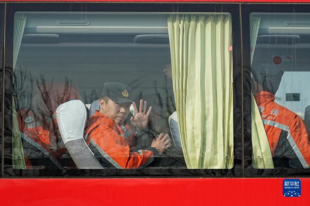 2月7日,中國救援隊隊員在北京大興消防訓練基地揮手告別。