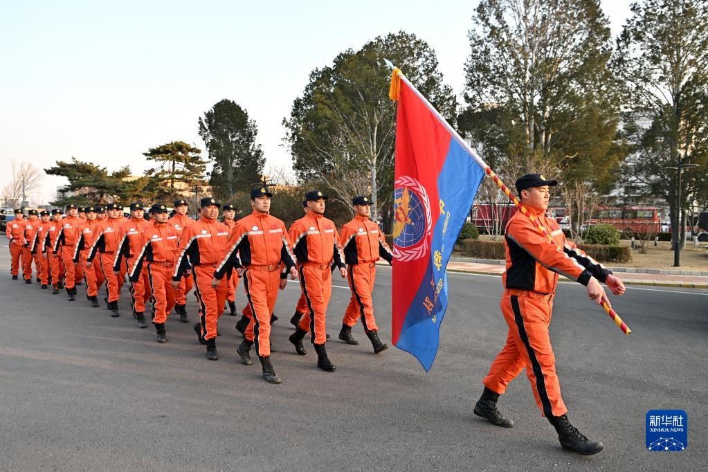 2月7日,中國救援隊在首都機(jī)場列隊行進(jìn)。