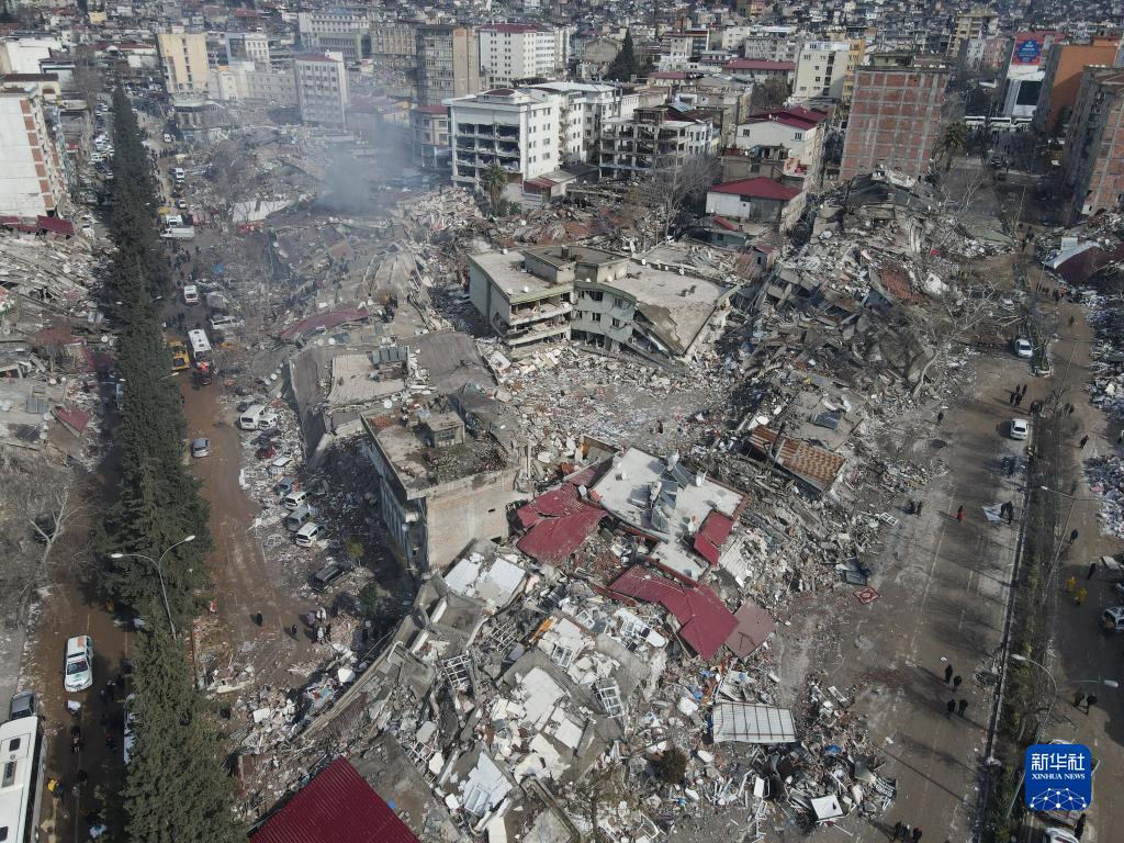 這是2月7日在土耳其南部卡赫拉曼馬拉什市市中心拍攝的震后景象(無人機照片)。卡赫拉曼馬拉什市是本次地震重災區卡赫拉曼馬拉什省省會,是遭受地震破壞最為嚴重的城市之一。