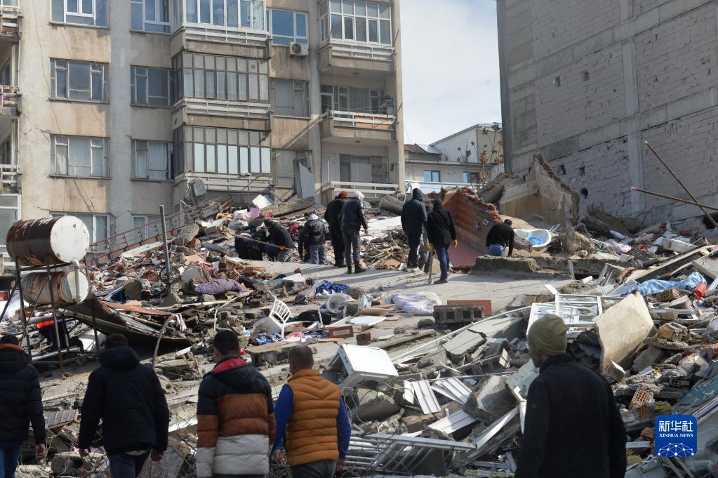 2月7日,人們聚集在土耳其南部卡赫拉曼馬拉什市一處地震廢墟。