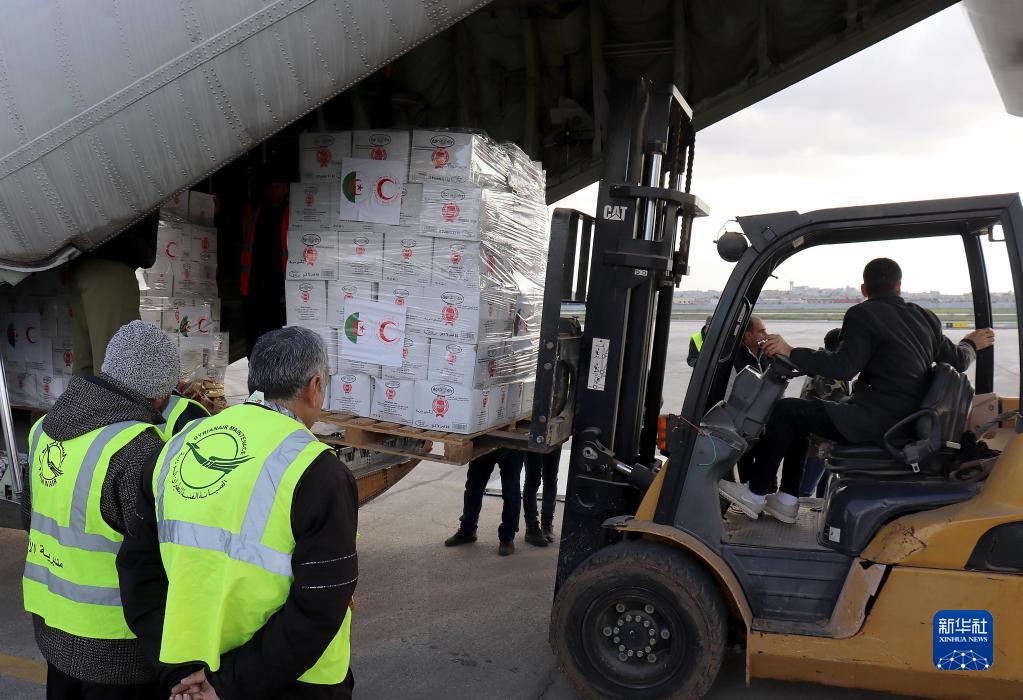 2月7日,在敘利亞阿勒頗國際機場,工作人員卸載阿爾及利亞提供的救援物資。