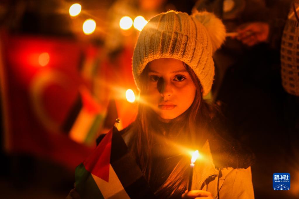 2月7日,在加沙地帶汗尤尼斯,一名兒童手拿蠟燭悼念地震遇難者。