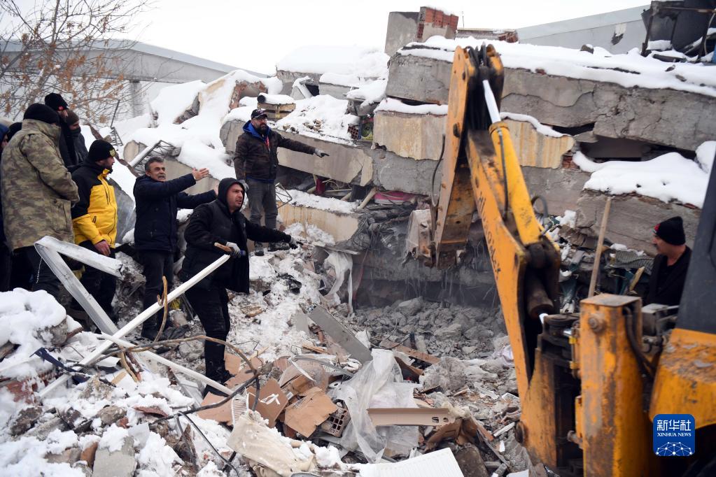 2月7日,在土耳其卡赫拉曼馬拉什省南部的埃爾比斯坦地區(qū),救援人員在一處地震廢墟搜救。