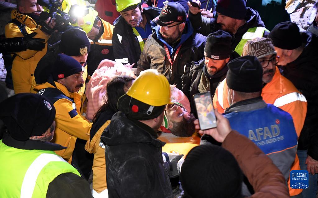 2月7日晚,在土耳其卡赫拉曼馬拉什省南部的埃爾比斯坦地區,救援人員轉移地震廢墟中的幸存者。