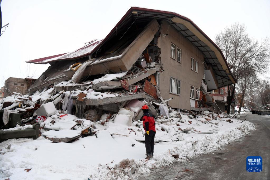 2月7日,在土耳其卡赫拉曼馬拉什省南部的埃爾比斯坦地區(qū),救援人員在一處受損建筑外喊話。