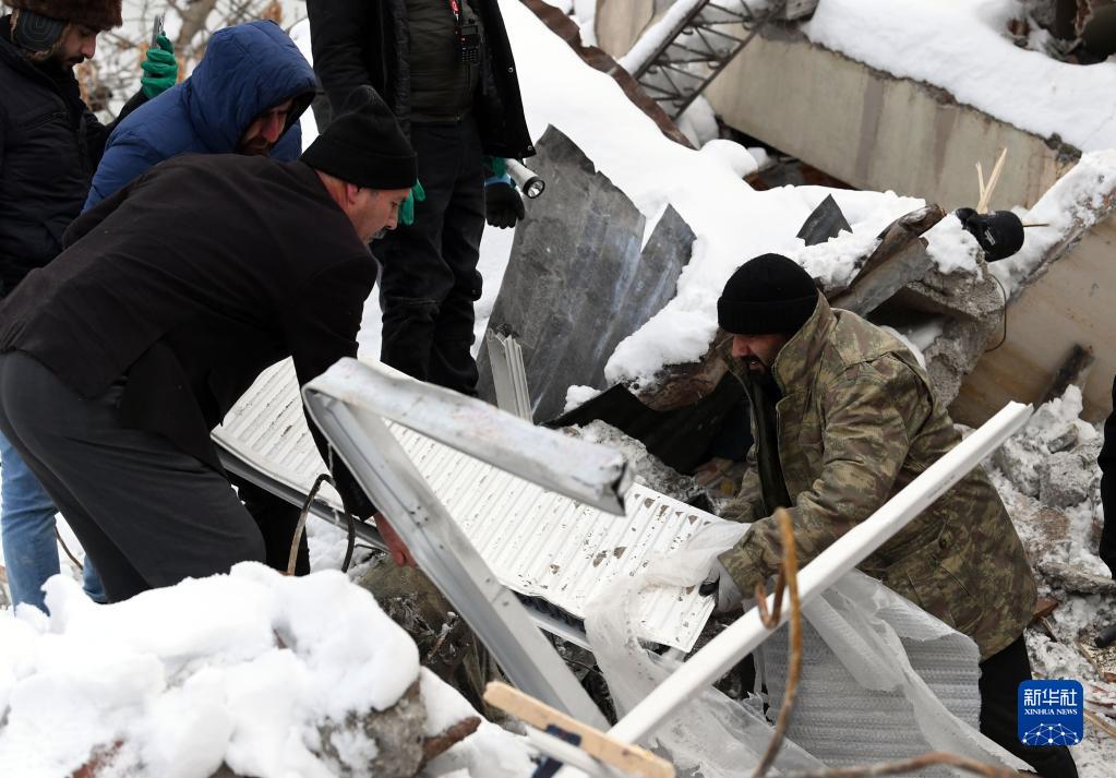 2月7日,在土耳其卡赫拉曼馬拉什省南部的埃爾比斯坦地區(qū),救援人員在一處地震廢墟搜救。
