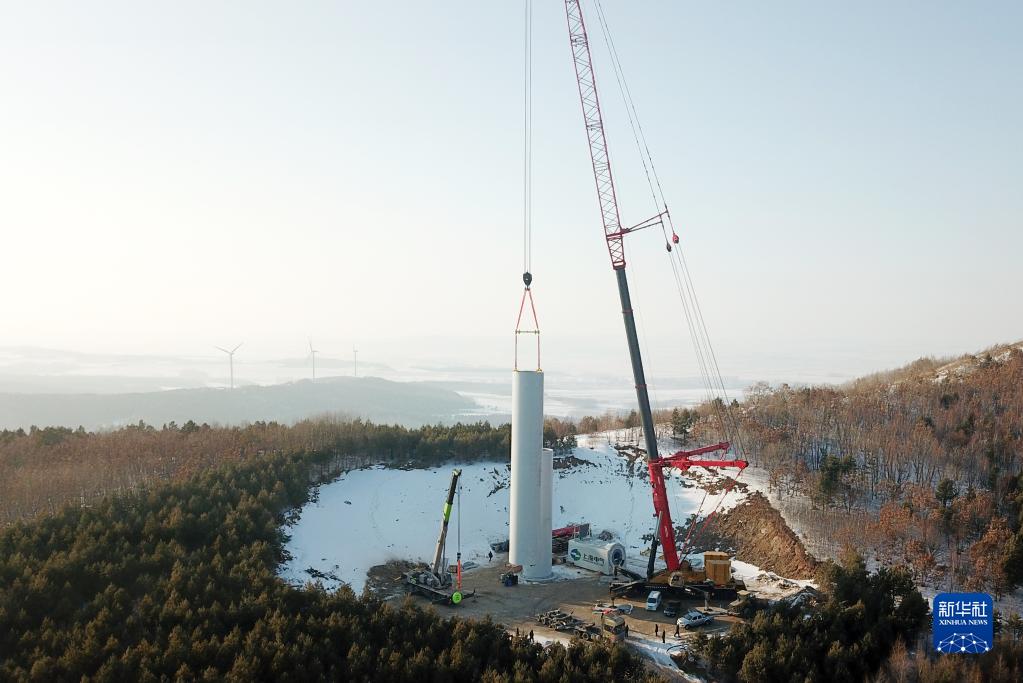 2月7日拍攝的華電黑龍江區域哈爾濱依蘭雞冠山風電場三期工程風電機組吊裝現場(無人機照片)。