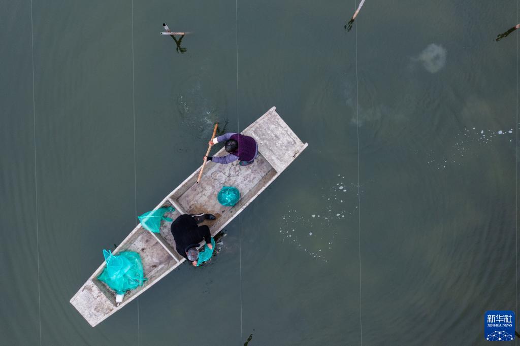 2月8日,湖州市織里鎮喬溇村的太湖蟹養殖戶把蟹苗放入養殖塘內(無人機照片)。