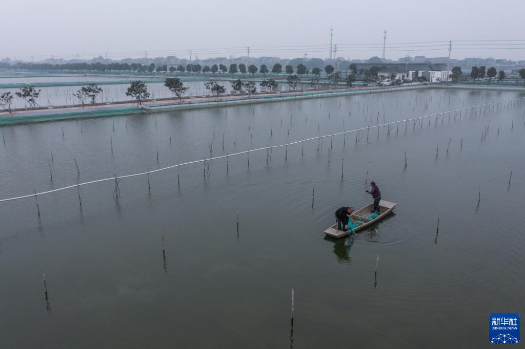 2月8日,湖州市織里鎮喬溇村的太湖蟹養殖戶把太湖蟹苗放入養殖塘內(無人機照片)。
