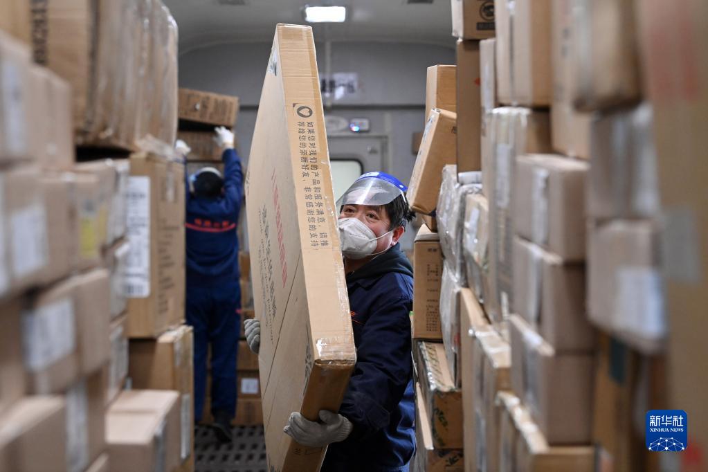 2月8日,在天津站1站臺,工作人員往列車上裝貨。