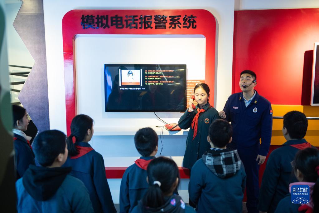 2月8日,在常德市武陵區第一小學安全教育館,消防隊員指導學生在“火情”發生后報警。
