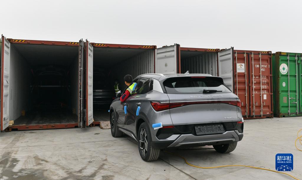 2月8日,國產(chǎn)新能源汽車駛?cè)爰b箱裝運(yùn)。