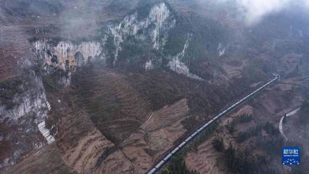 列車(chē)從滬昆鐵路茨沖至濫壩區(qū)段駛過(guò)(2月8日攝,無(wú)人機(jī)照片)。