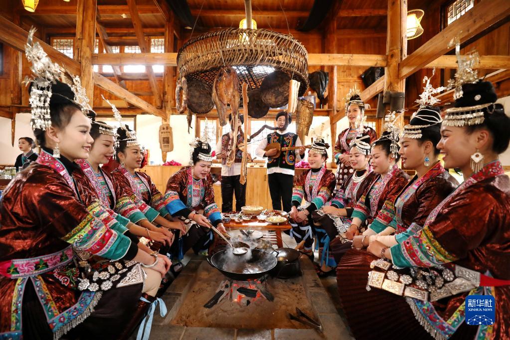2月9日,在光輝村馬灣茶園,侗族姑娘在展示侗族打油茶。