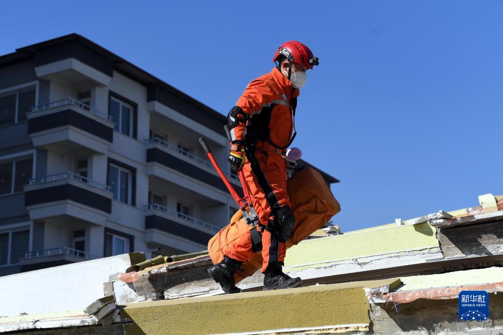2月9日,中國救援隊隊員在土耳其哈塔伊省安塔基亞市的受損建筑上開展救援工作。