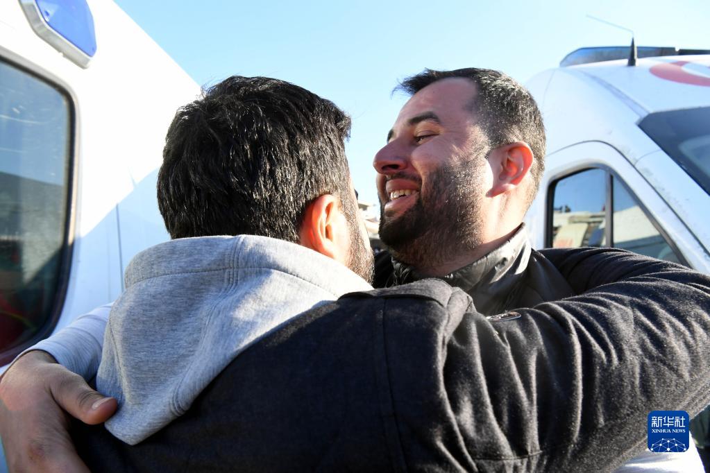 9日,在土耳其南部地震重災區哈塔伊省安塔基亞市,中土救援隊聯手救出兩名地震幸存者。