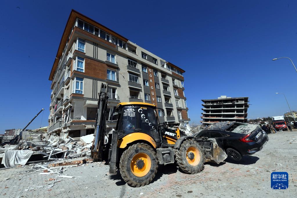 2月9日,大型機(jī)械在土耳其哈塔伊省安塔基亞市一處受損的建筑物作業(yè)。
