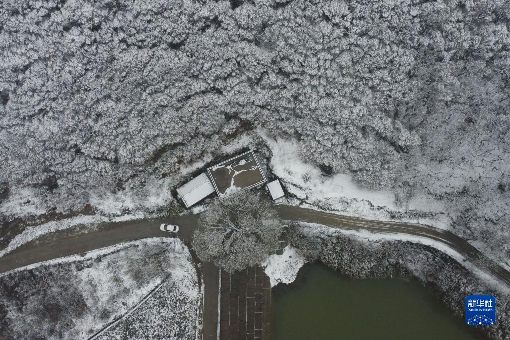 2月9日,一輛汽車行駛在河南省平頂山市寶豐縣觀音堂林業生態旅游示范區(無人機照片)。