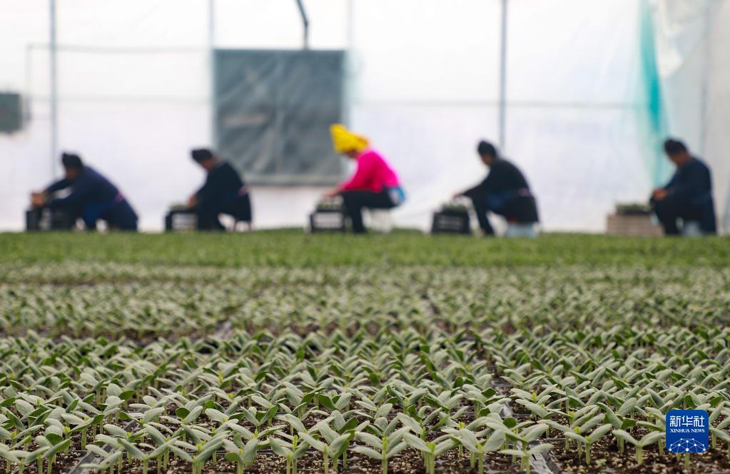 2月9日,貴州省黔東南苗族侗族自治州丹寨縣興仁鎮(zhèn)城江村,瓜農(nóng)在西瓜育苗基地嫁接西瓜苗。