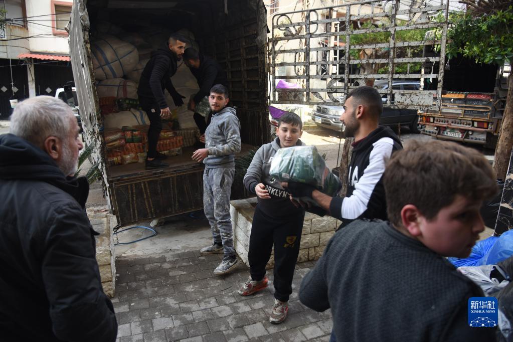 2月9日,在黎巴嫩的黎波里,人們搬運(yùn)援助敘利亞拉塔基亞的物資。