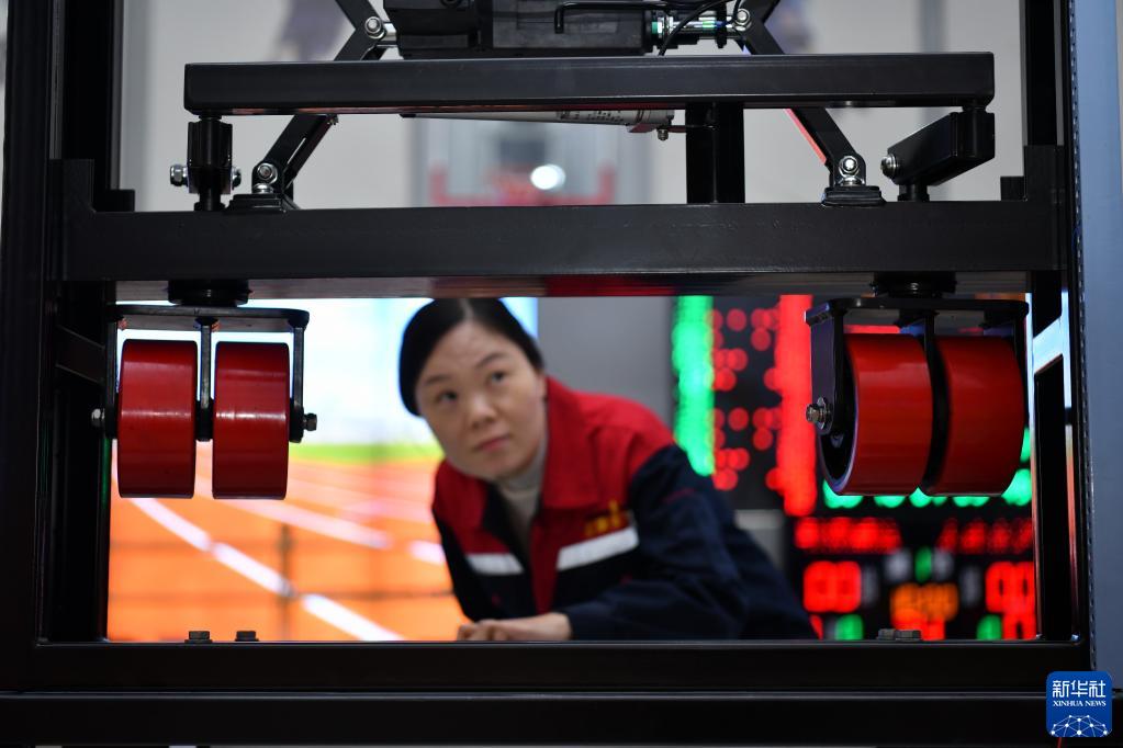 2月9日,在位于海興縣的河北宏康體育器材有限公司,工人在檢測籃球架零部件。