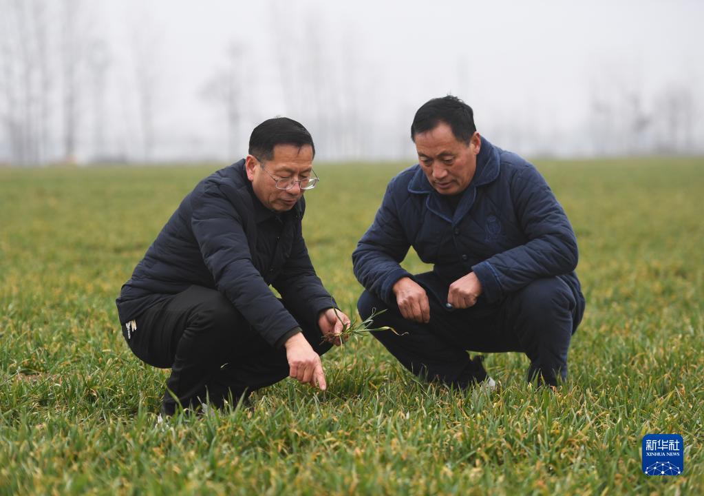 2月9日,在河南省商丘市寧陵縣張弓鎮(zhèn)黃莊村,農(nóng)技人員(左)在指導(dǎo)種糧大戶做好春耕備耕工作。