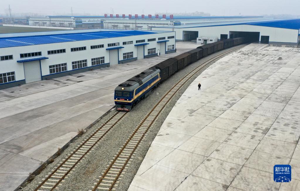 2月10日,一列裝載著化肥的列車駛出河南萬莊安陽物流園(無人機照片)。