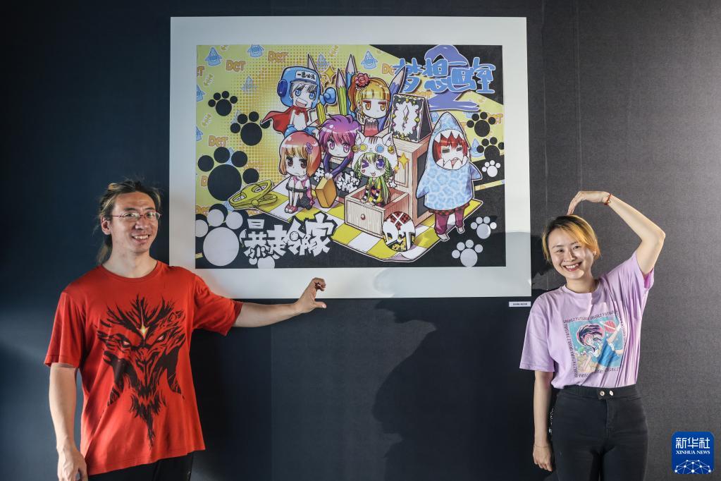 2月9日,在海口市龍橋鎮昌學村的“燚界·漫創社”創業孵化基地的展廳內,漫畫家“極樂鳥”(左)和妻子“翔”在自己的動漫作品前合影。