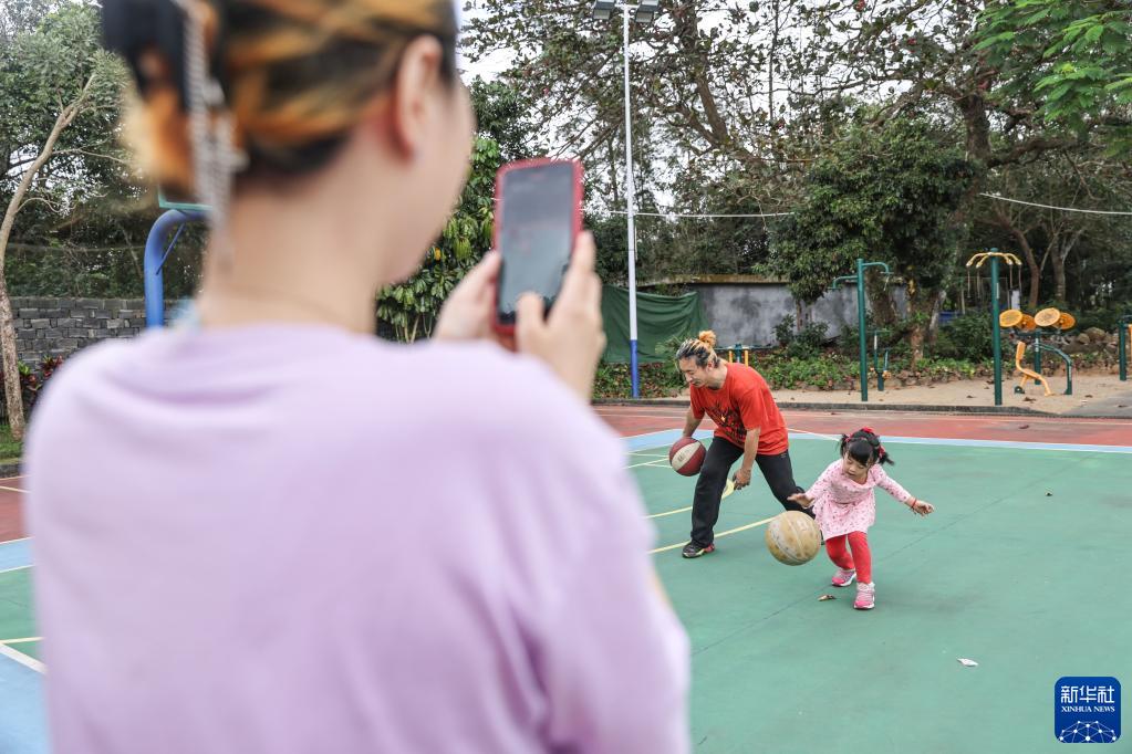 2月9日,漫畫家“極樂鳥”(中)和家人在海口市龍橋鎮(zhèn)昌學(xué)村的籃球場內(nèi)玩耍。