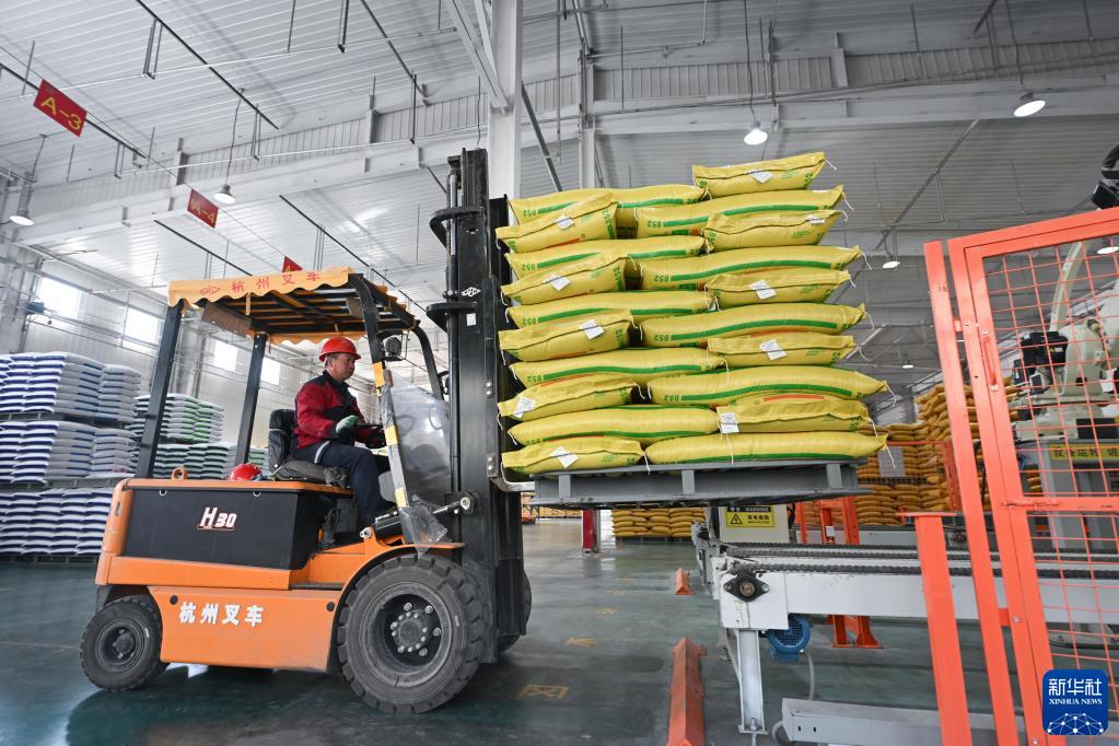 2月10日,在位于青海省海東市平安區(qū)的青海華農(nóng)恒青農(nóng)牧有限公司,工人駕駛叉車搬運成品飼料。