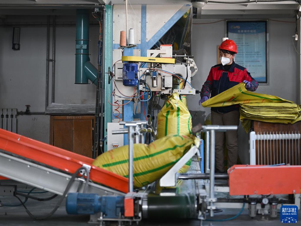 2月10日,在位于青海省海東市平安區(qū)的青海華農(nóng)恒青農(nóng)牧有限公司,工人打包成品飼料。