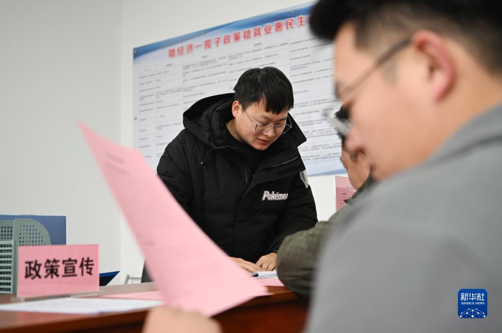 2月10日,在韓村“就業(yè)驛站”內(nèi),工作人員(左一)給村民進(jìn)行政策講解。