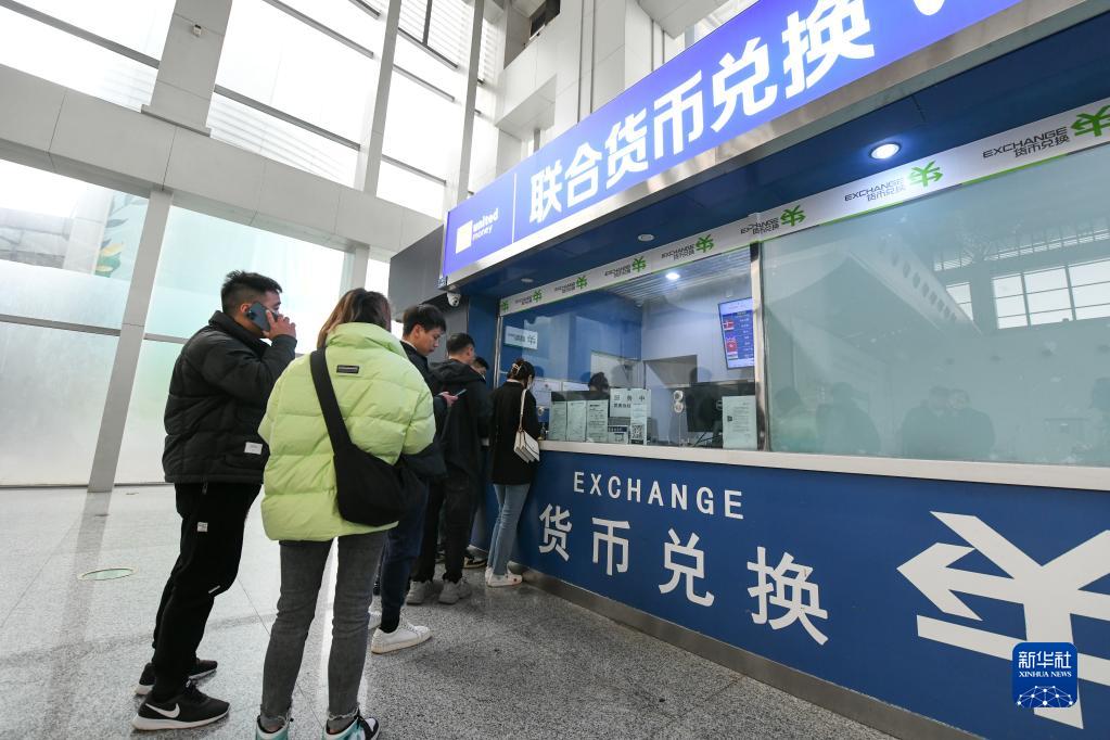 2月10日,在成都雙流國際機場T1航站樓,旅客排隊兌換外幣。