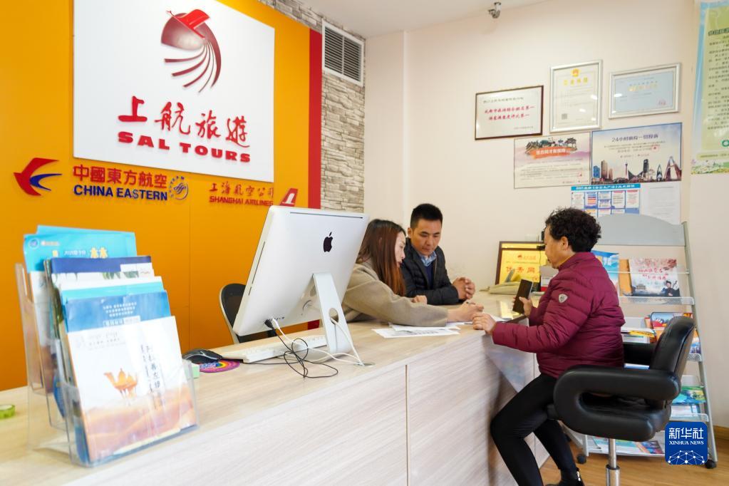 2月9日,在成都市郫都區一家旅行社,市民在咨詢出境游產品。