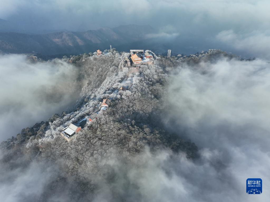 當(dāng)日,雪后的河北唐山市遷西縣出現(xiàn)云海霧凇景觀,山峰、樹木、古建筑在云霧中時隱時現(xiàn),美如畫卷。