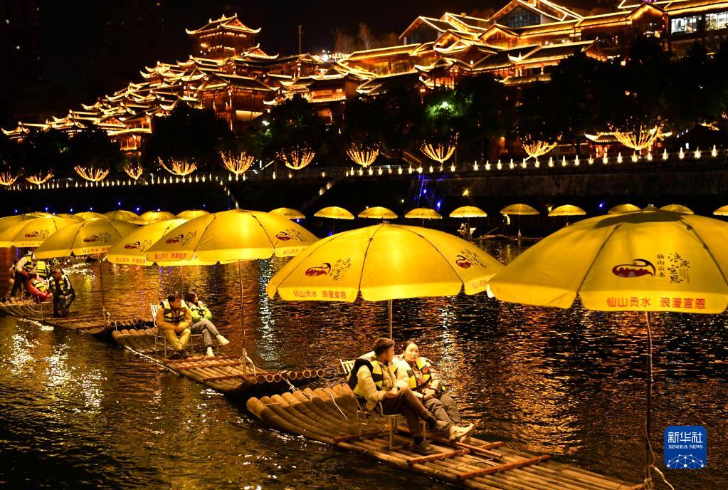 2月9日,游客乘坐竹筏在宣恩縣興隆老街前的貢水河上游玩。