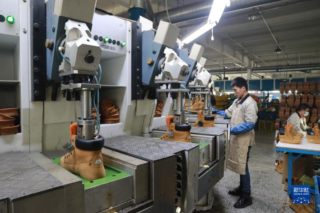 2月10日,工人在山東省高密市朝陽街道一家制鞋企業的車間內忙碌。