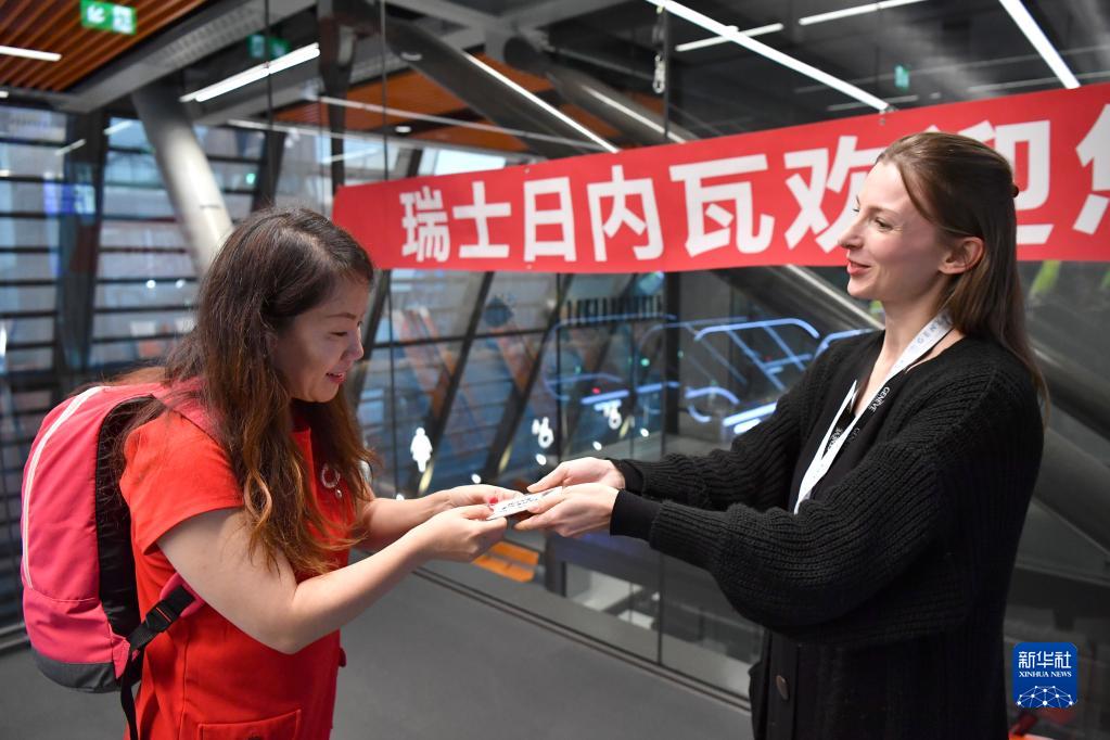 2月9日,在瑞士日內(nèi)瓦國(guó)際機(jī)場(chǎng),中國(guó)旅客接受日內(nèi)瓦旅游局工作人員遞上的瑞士特色紀(jì)念品。