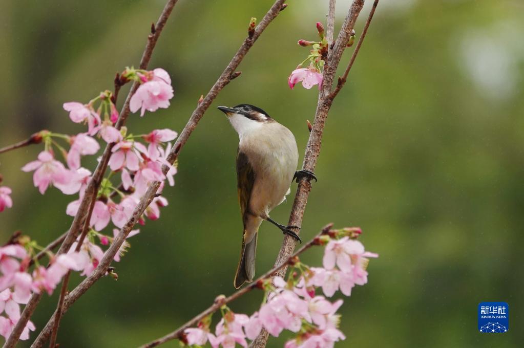 2月10日,在廣西南寧市青秀山風景區,一只小鳥站在櫻花的枝頭。