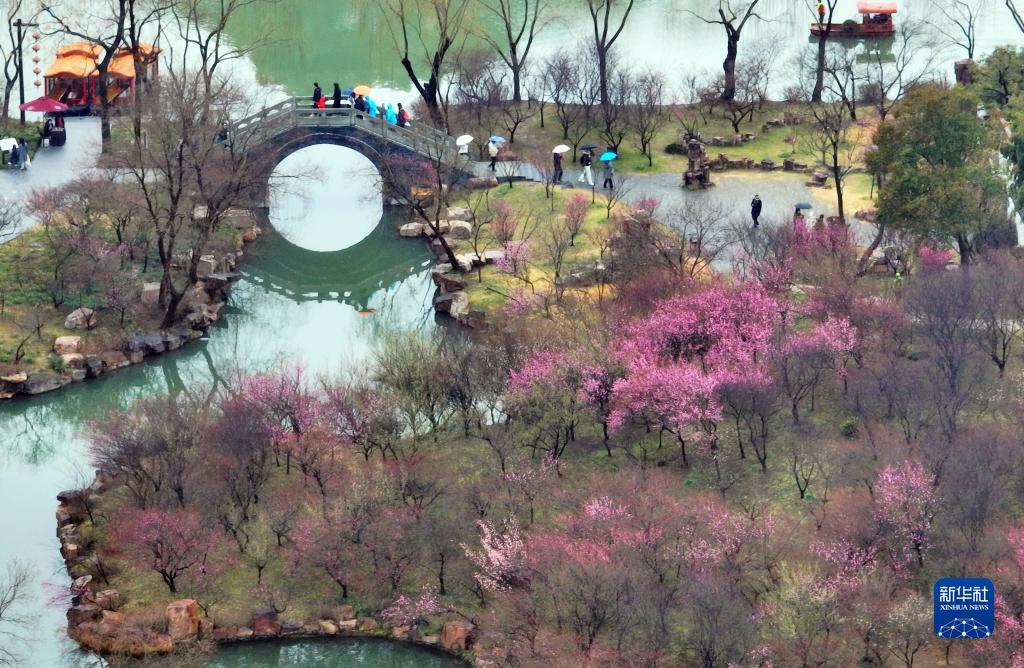 2月10日,在江蘇揚州瘦西湖風景區,游客在賞花游玩(無人機照片)。