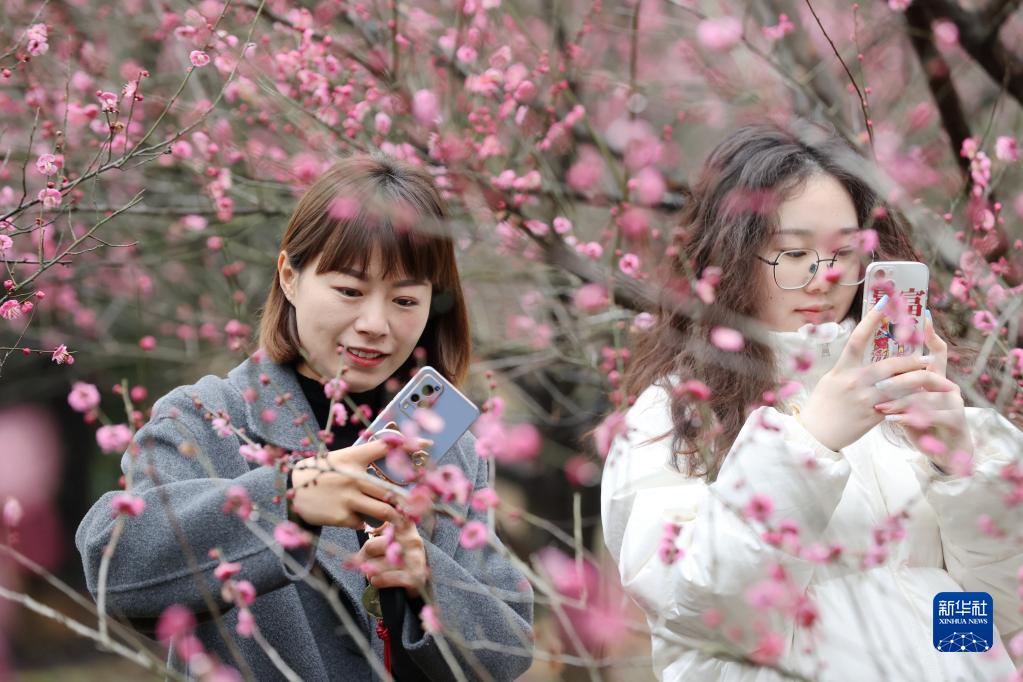2月11日,游客在浙江省湖州市德清縣下渚湖街道上楊村梅花園賞梅。