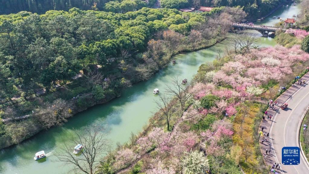 2月11日,游客在貴州省黔西南布依族苗族自治州興義市貴州醇景區觀賞梅花(無人機照片)。