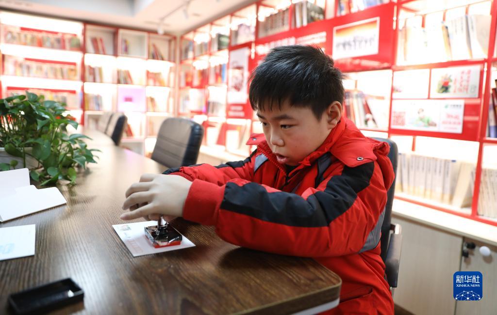 2月10日,一個小朋友在雷鋒紀(jì)念館內(nèi)的雷鋒郵局里為主題明信片蓋上紀(jì)念戳。