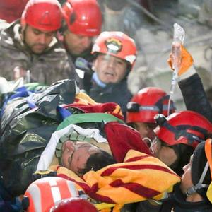 2月10日晚,在土耳其加濟安泰普省,救援人員轉移獲救的幸存者。